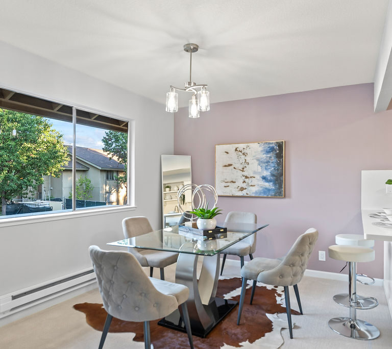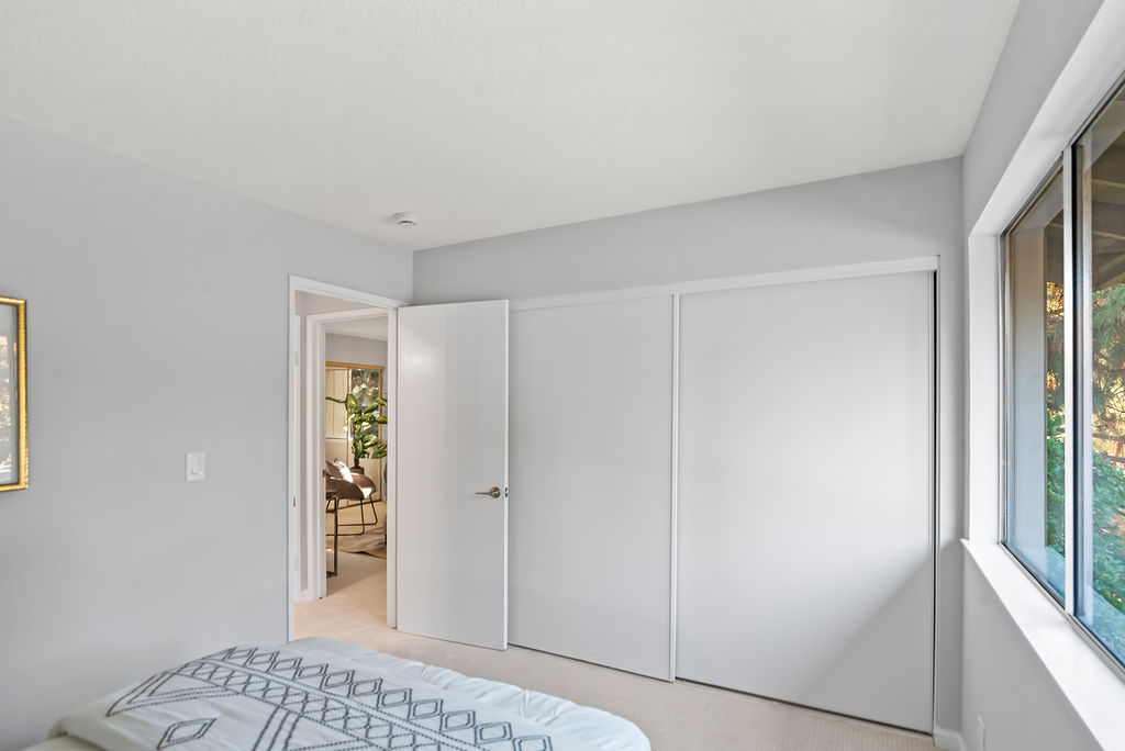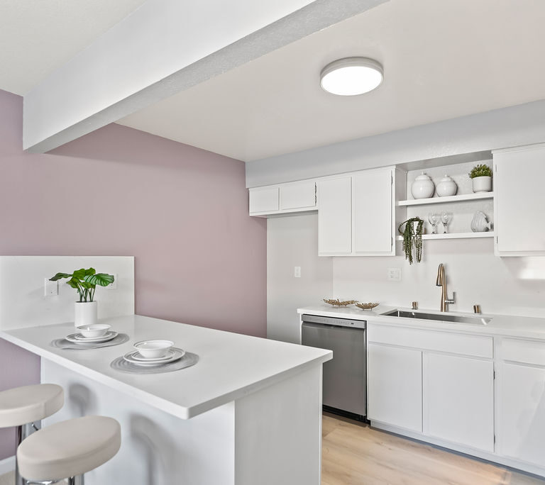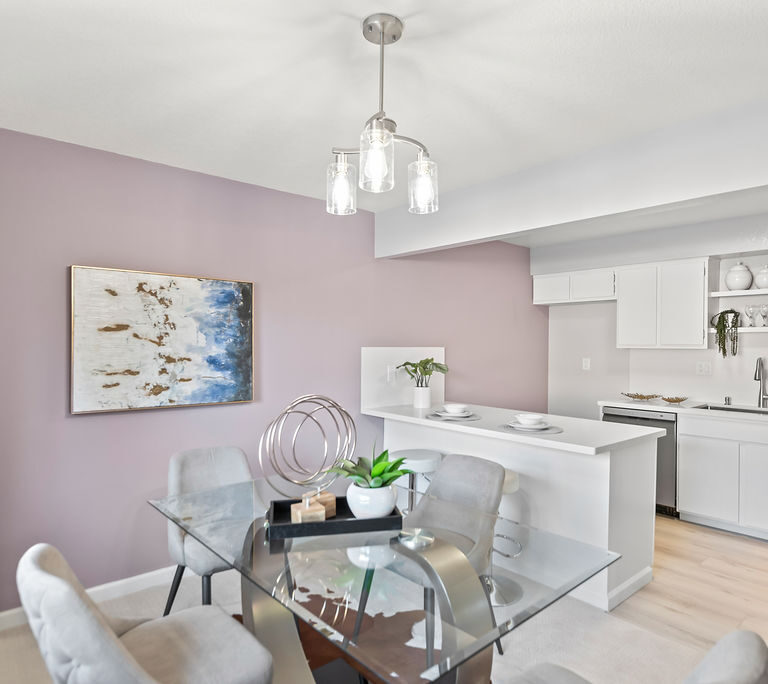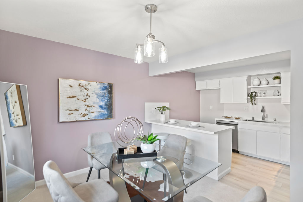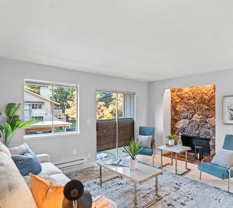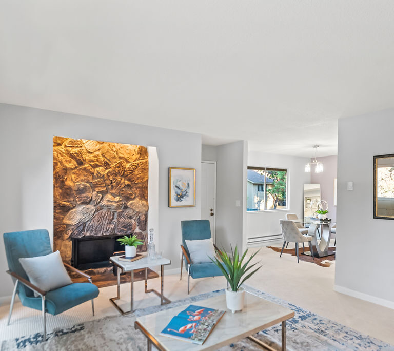 The kitchen boasts attractive quartz countertops with matching backsplash, new stainless steel appliances, and convenient peninsula with seating that connects to dining room for easy hosting! The living room has statement stone fireplace and opens to spacious balcony perfect for grilling, morning coffee, or yoga with evergreen and seasonally-blooming trees as your backdrop. Primary suite features two closets and direct access to dual-entry bath with seated vanity space. Additional highlights include in-unit laundry, central heat, and ample storage.